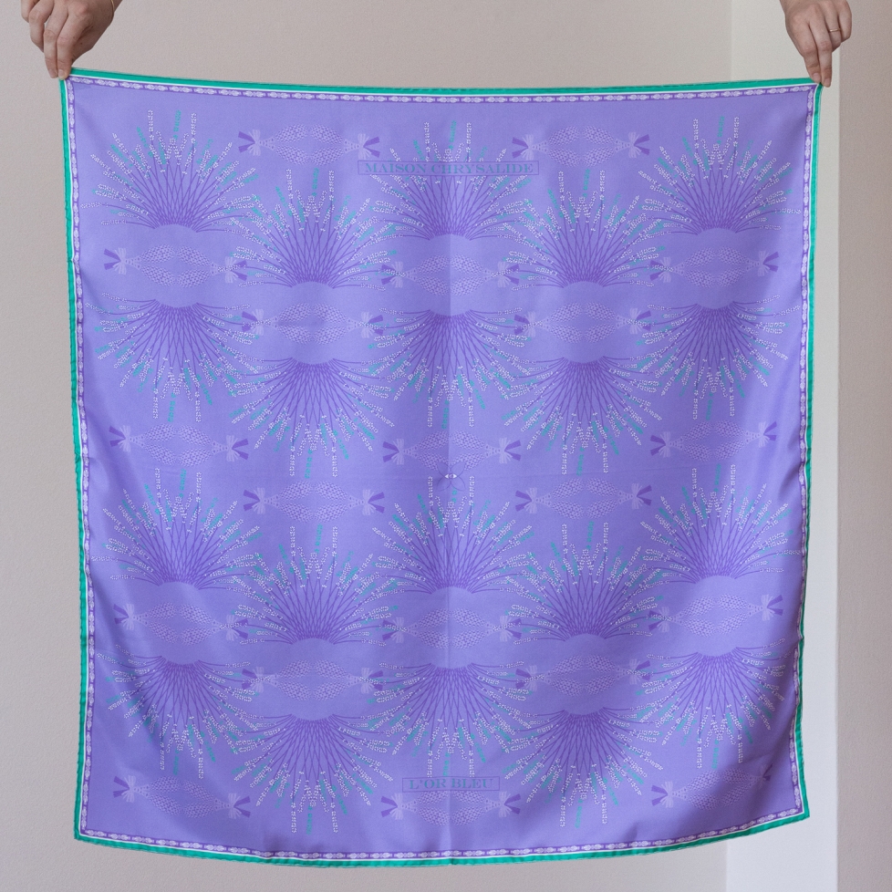 Ce produit haut de gamme a été imaginé et dessiné à la main pour être ensuite retravaillé et colorisé par la créatrice de la Maison Chrysalide, à Paris. Dans un second temps, il a été envoyé à Lyon dans une soierie où il a été imprimé sur un twill de soie de 14 mômes, qui offre le meilleur compromis entre drapé et qualité, et correspond aux standards...