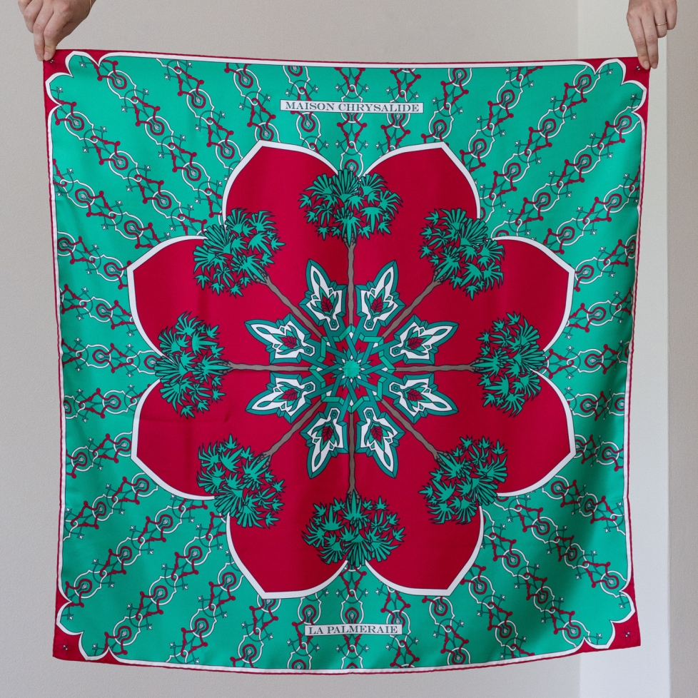 This high range product was imagined and hand-drawn before being re-worked and colorized by the Maison Chrysalide creator, in Paris. Secondly, it was sent in Lyon in a silk fabric where it was printed on a 14-mômes silk twill, which offers the best agreement between drape and quality, and fits to the most famous Fashion Houses high-end standards.